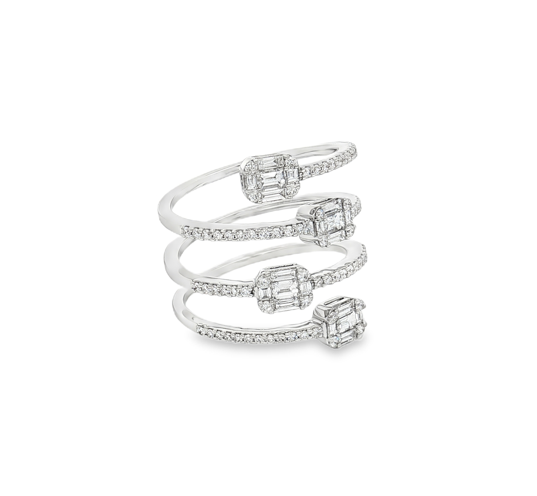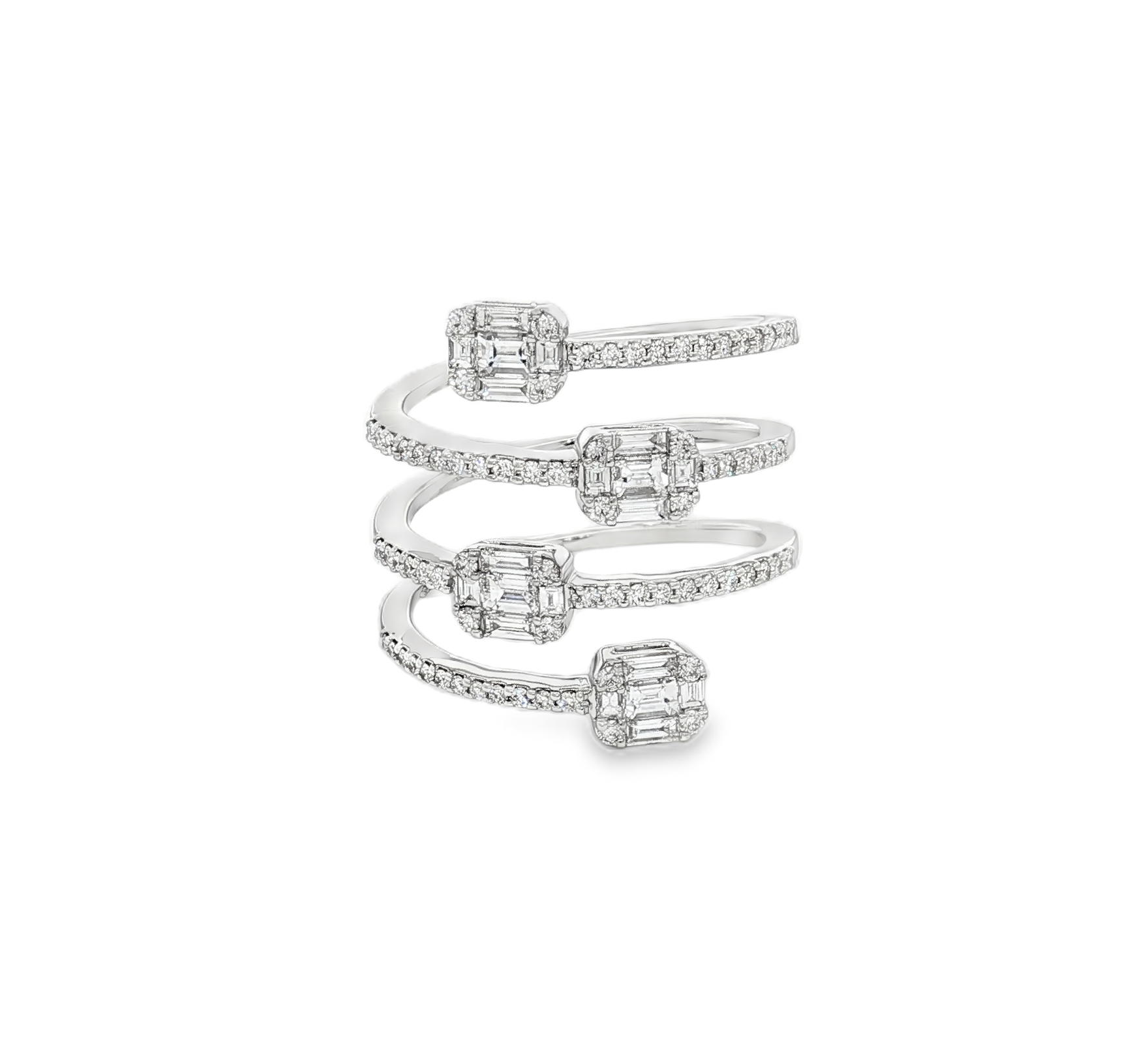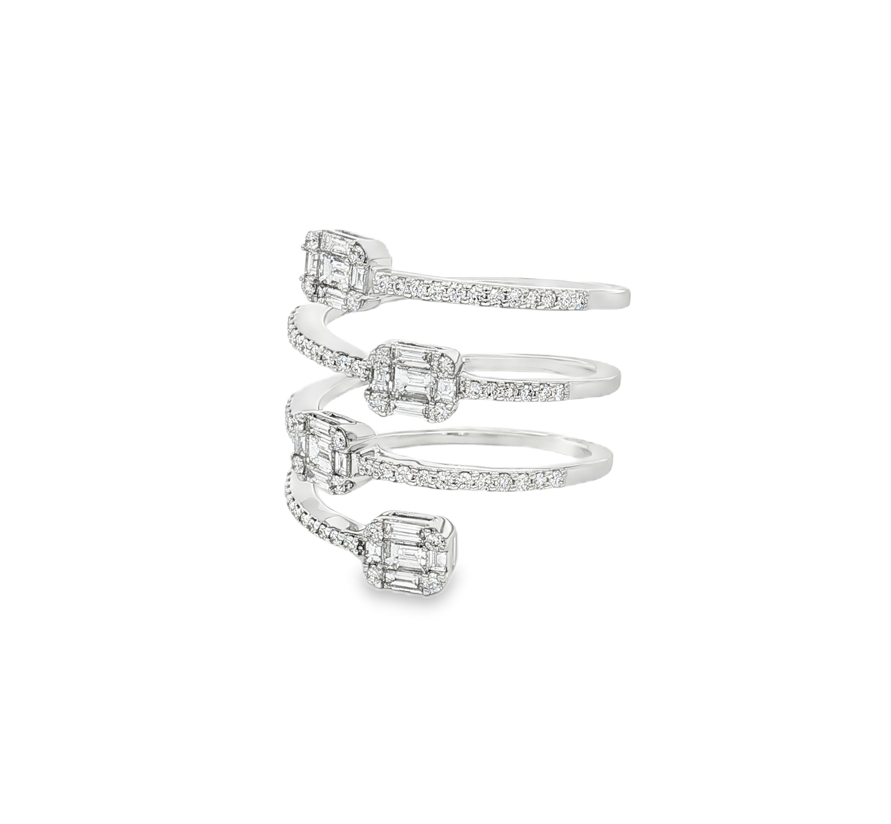 This 1.16ctw diamond spiral ring in 18K white gold showcases four dazzling baguette diamond clusters along a pavé spiral band. Its contemporary multi-row design exudes movement, brilliance, and modern sophistication—an exquisite statement of luxury and timeless elegance.