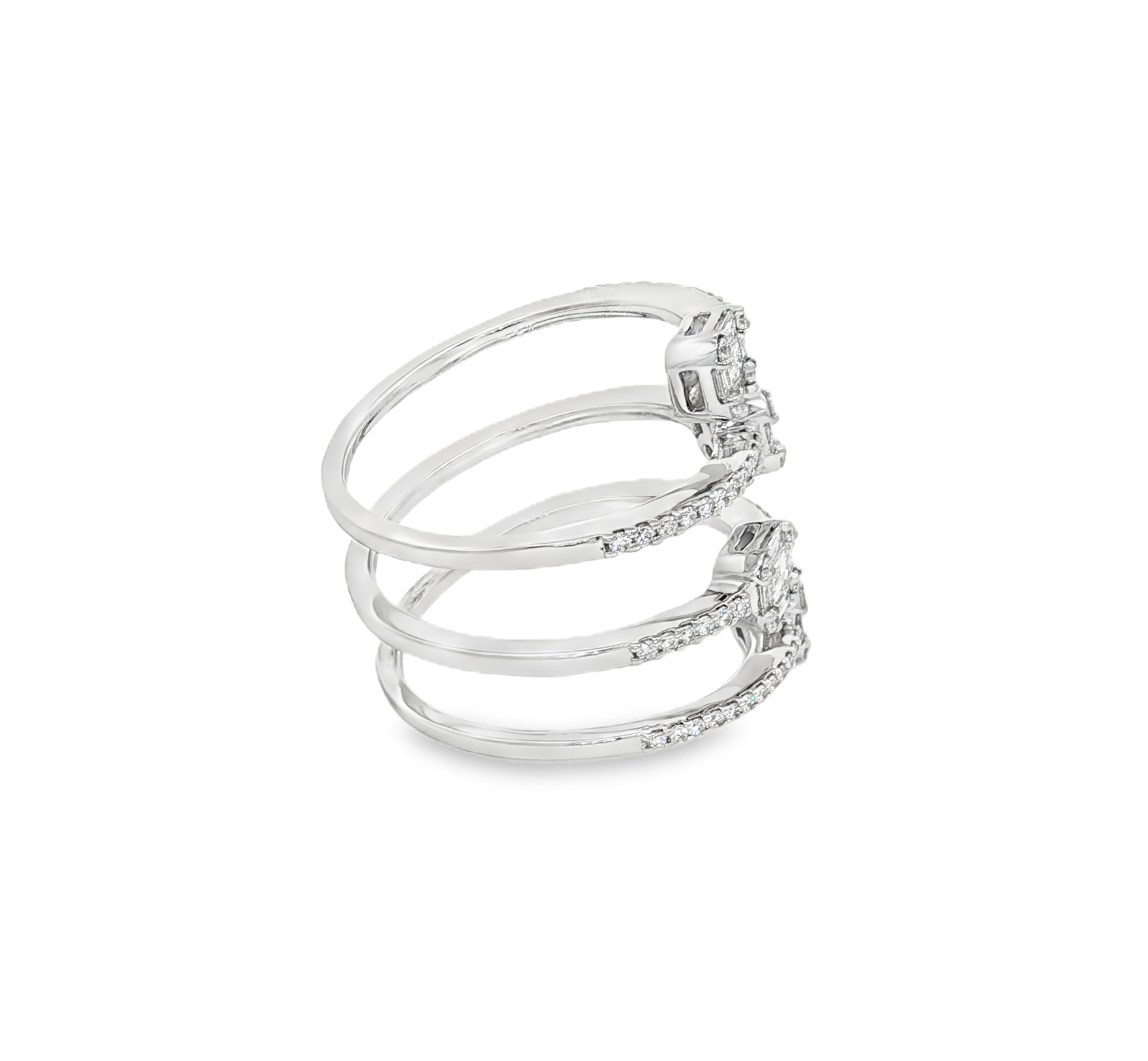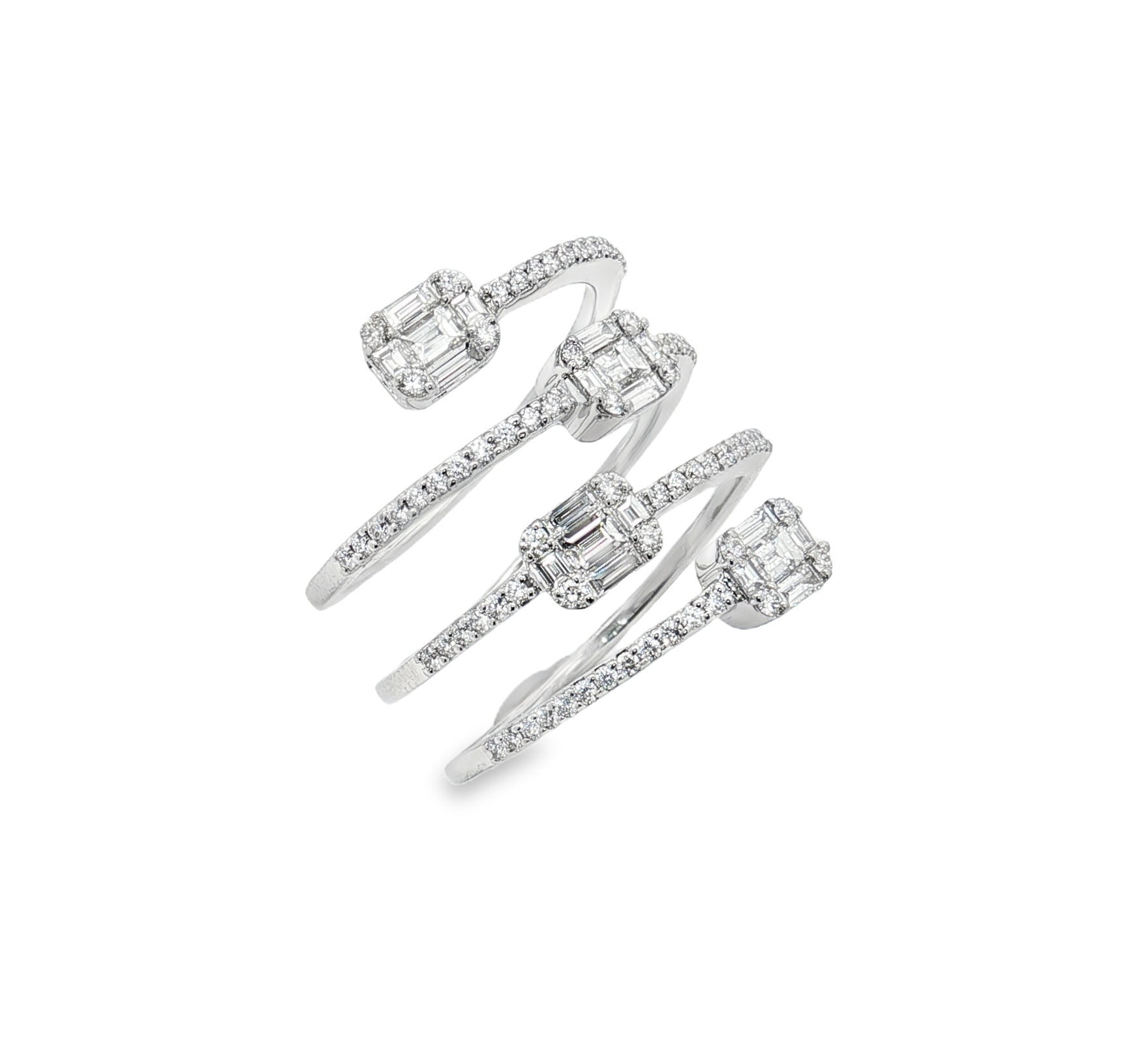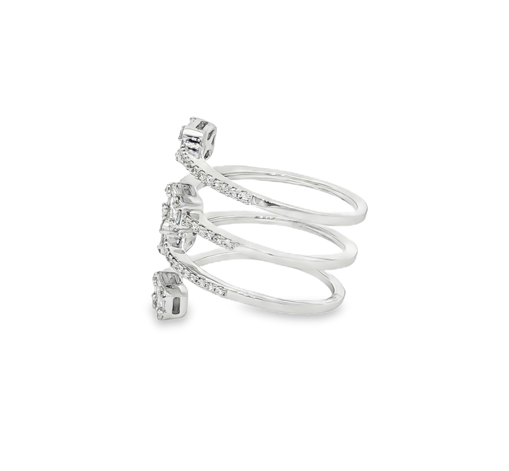 This 1.16ctw diamond spiral ring in 18K white gold showcases four dazzling baguette diamond clusters along a pavé spiral band. Its contemporary multi-row design exudes movement, brilliance, and modern sophistication—an exquisite statement of luxury and timeless elegance.
