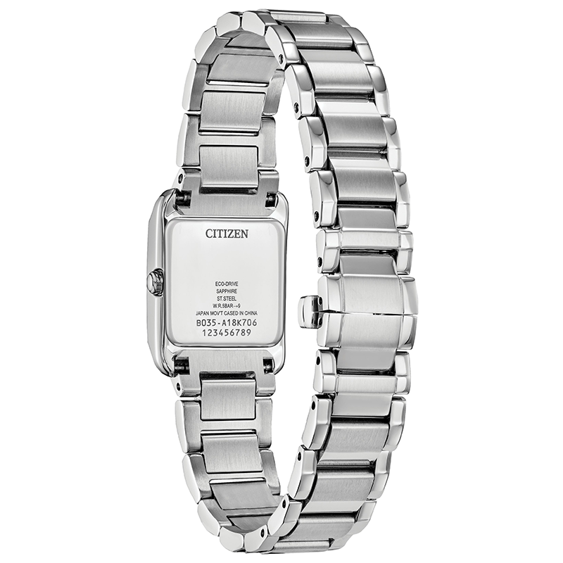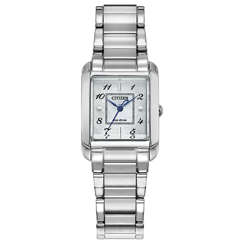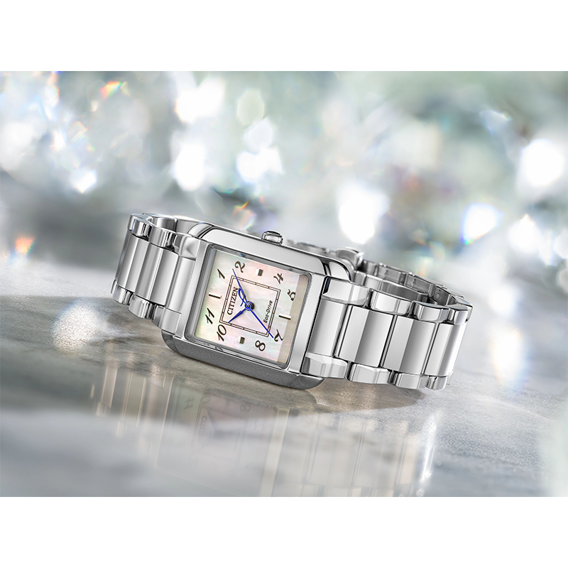 Citizen Eco-Drive EW5600-52D showcases a refined 21.5mm rectangular stainless steel case, luminous mother-of-pearl dial, blue hands, and sapphire crystal. Powered by light, it never needs a battery. Classic bracelet styling delivers timeless elegance, durability, and reliable Japanese precision for everyday or dress wear.