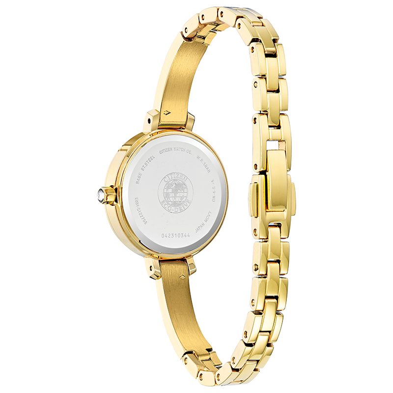 Citizen Eco-Drive EM0862-56D blends gold-tone elegance with a mother-of-pearl dial, crystal-accented bezel, and light-powered Eco-Drive technology. This refined women’s watch delivers sparkling style, maintenance-free performance, and everyday sophistication in a slim, jewelry-inspired design perfect for any occasion.