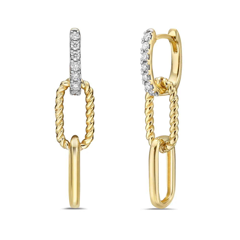 14K two-tone gold diamond paperclip earrings featuring natural round brilliant cut diamonds totaling 0.26 carats. Measuring 30 x 7mm, these modern link earrings combine polished yellow gold with white gold diamond-set hoops for a bold, elegant look perfect for everyday luxury or special occasions.
