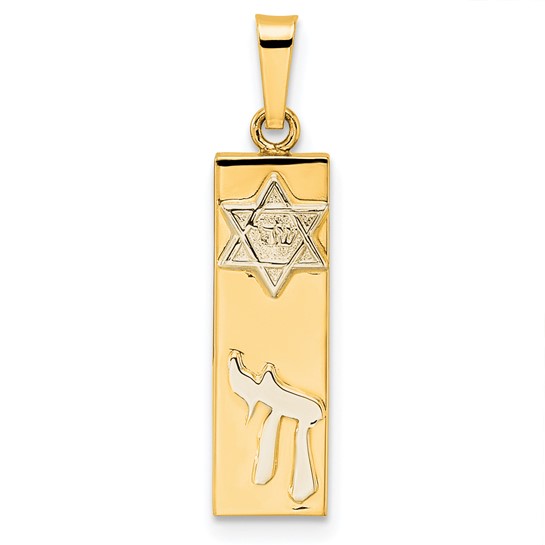 Elegant 14K two-tone gold Jewish pendant featuring the Star of David and Hebrew “Chai” symbol, representing life and faith. Crafted in polished yellow and white gold, this meaningful Mezuzah-style charm embodies spirituality, protection, and timeless Judaic tradition.